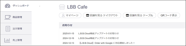ダッシュボードでは、各種設定用のボタンがあるほか、当日の注文数や注文金額、注文回数が多い商品などを確認できます。