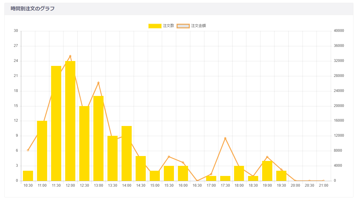 時間別の注文数、注文金額をグラフで確認できます。