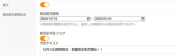 商品詳細の「商品販売期間設定」欄に「商品販売期間」を設定します。