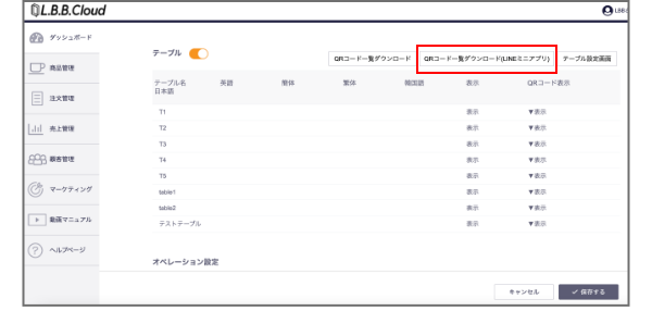 LINEミニアプリを経由しテーブルオーダーを利用する場合は、「QRコード一覧ダウンロード(LINEミニアプリ)」ボタンからダウンロードしたQRコードをテーブルへ設置してください。