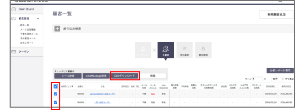 検索表示後、リストをダウンロードしたい顧客名の左のチェックボックスにチェックを入れ、CSVダウンロードを行います。