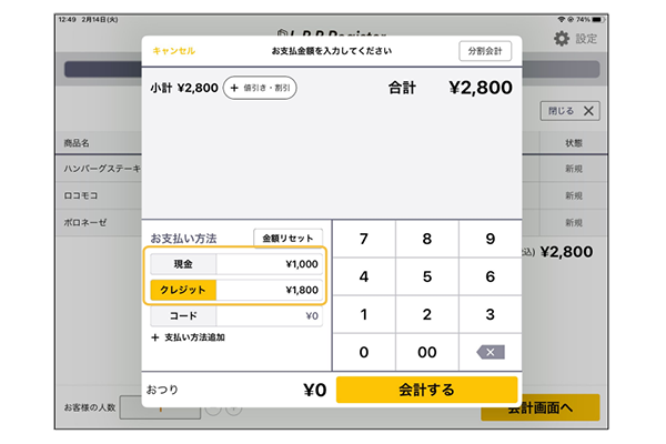 会計画面から精算するとき、お支払い方法を複数選択することも可能です。