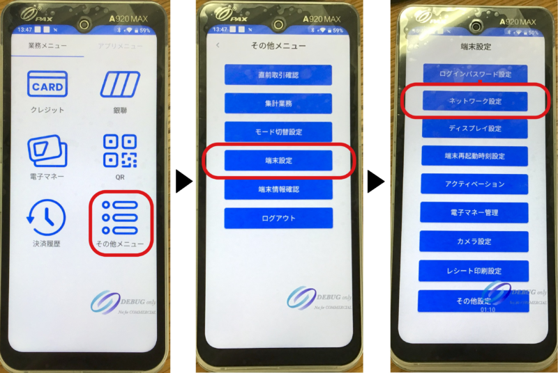 ※IPアドレスは、PayCASのホーム画面>業務メニュー>端末設定>ネットワーク設定からご確認ください。