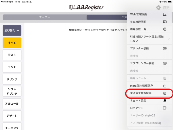 L.B.B.Registerの右上の設定からメニューを表示し、「決済端末情報保存」をタップします。