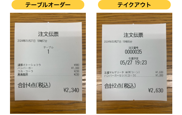 テイクアウト・・・注文番号と予約注文利用の場合は、引き渡し予定時間が記載されます。