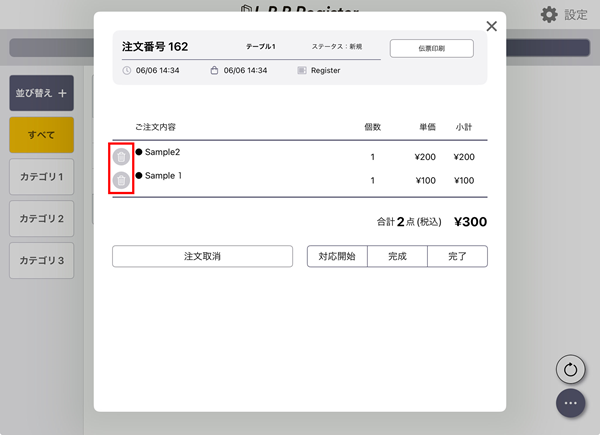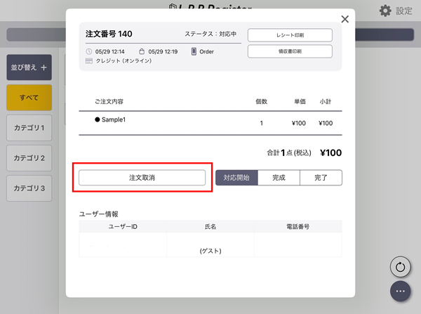 会計完了後に注文のキャンセルが必要になった場合も、L.B.B.Registerアプリ上と、L.B.B.Cloud管理画面上どちらかからキャンセル処理が可能です。