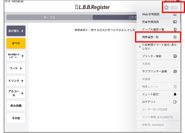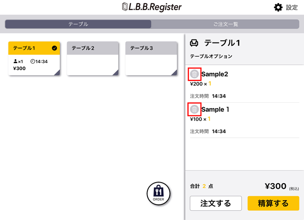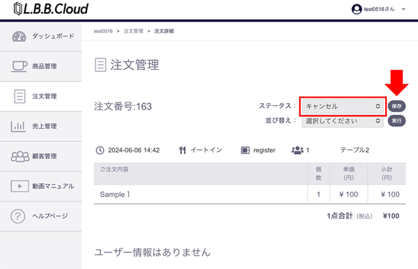 L.B.B.Registerアプリで会計をおこなったテーブルの注文は、L.B.B.Cloud管理画面上でキャンセルできません。