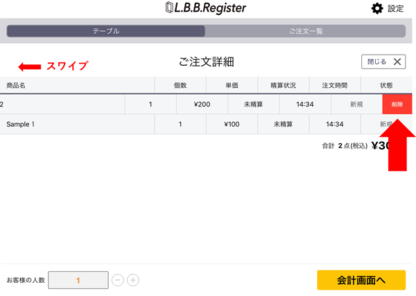 退店時まとめて精算でご利用の場合、L.B.B.Registerアプリにて会計済みのテーブル注文は、L.B.B.Cloud管理画面上でキャンセルできません。