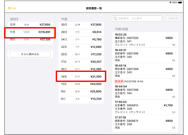 月・日ごとの集計されています。特定の注文履歴を確認したい場合は、月>日から精算時間や確認するか、注文番号(精算番号)で検索します。