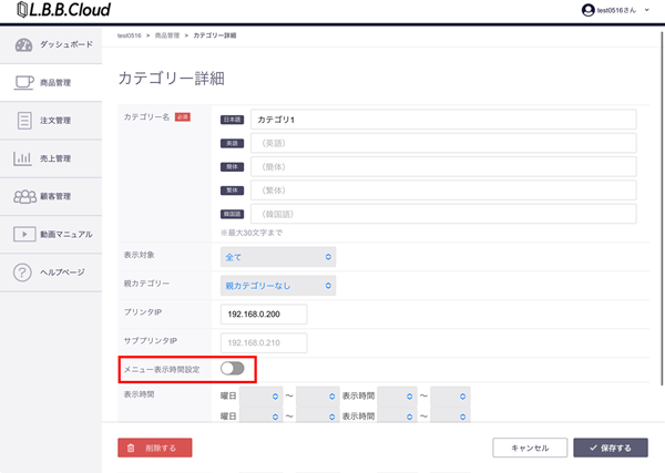 L.B.B.Cloudにて商品やカテゴリーが登録されているにも関わらず、注文画面でカテゴリーが表示されない場合は、メニュー表示時間設定により表示時間外になっている可能性があります。