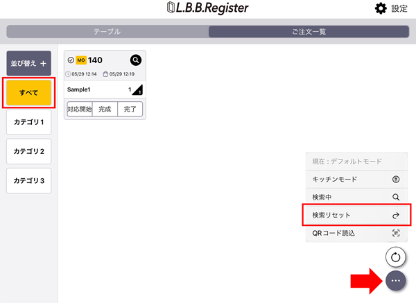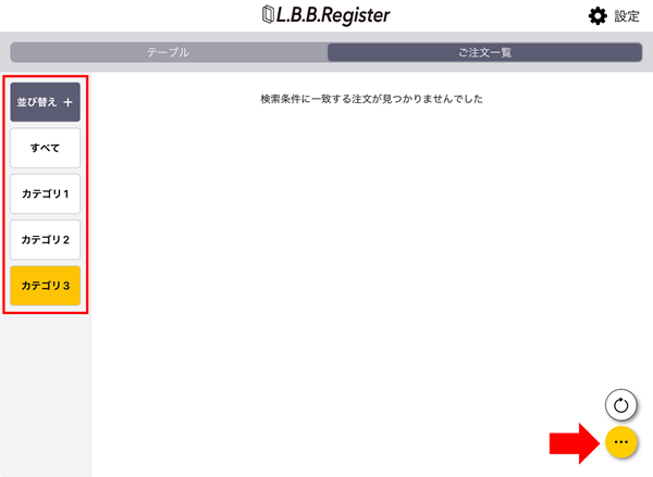 L.B.B.Registerの注文一覧画面より、左側のカテゴリー表示切り替えボタンを押していないか確認してください。ボタンが黄色になっているカテゴリーが表示されます。