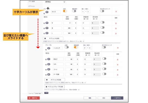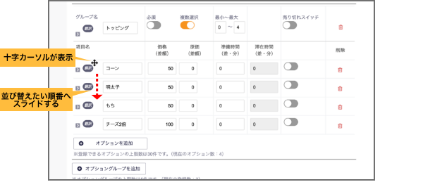 【商品追加(商品詳細)】オプショングループ・オプションの並び替え