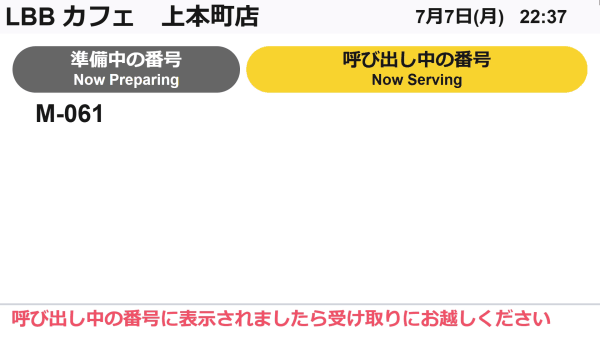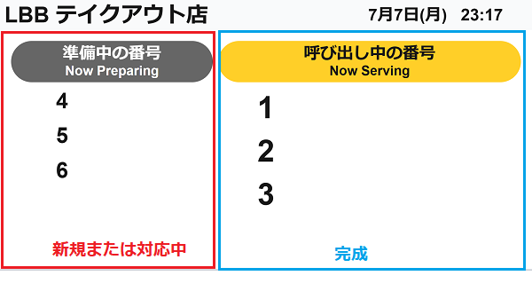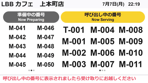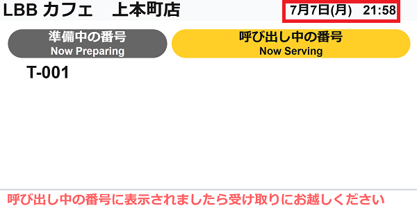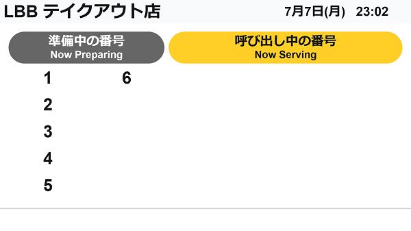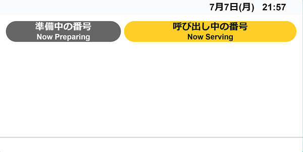 呼び出しモニターには、当日分の注文番号のみが表示されます。日付が変わる24時になると、その日の注文は呼び出しモニターから非表示になります。