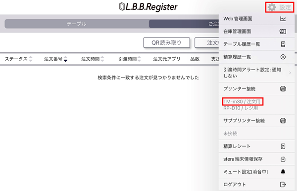 L.B.B.Registerで、画面右上の「設定」>プリンター接続>「注文用(Bluetooth)」を選択します。