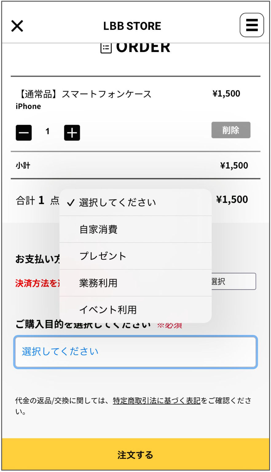 未選択のまま注文しようとすると、「購入目的を選択してください」というエラーメッセージが表示されます。