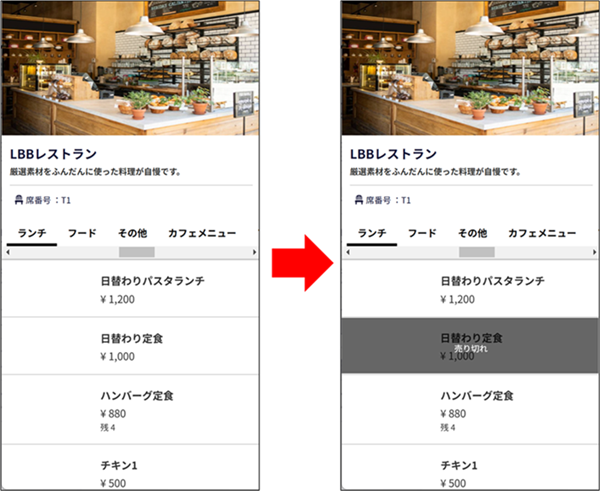 モバイルオーダー画面では、売り切れになった商品はグレーアウト状態になり、上から白文字で「売り切れ」と表示されます。