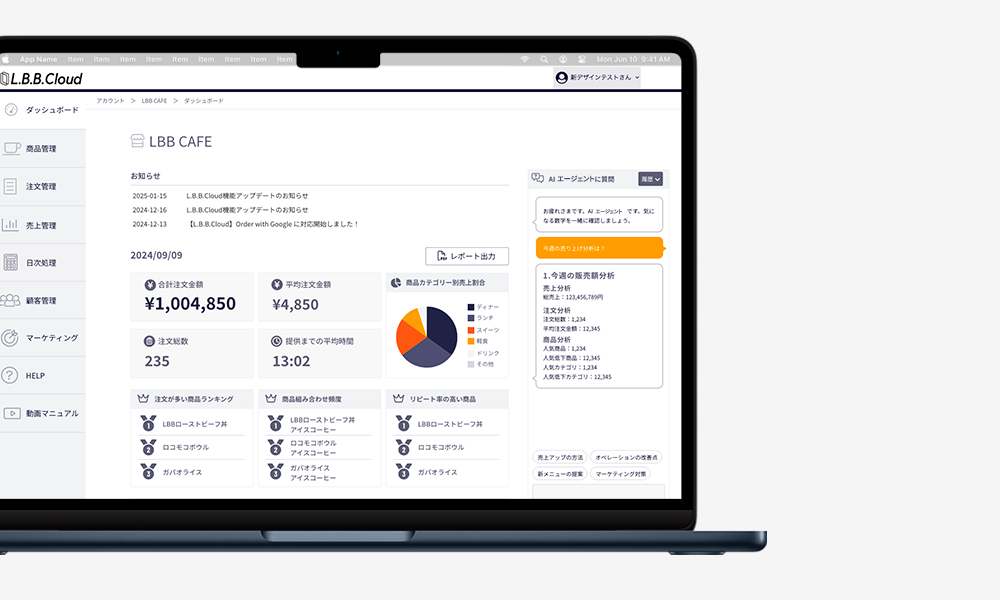 システムの使い方等を質問すると該当のマニュアルページを案内するサポート能力を有するほか、日報の自動作成、売上の集計・分析、メニュー構成や売上改善の相談など、幅広く店舗運営をサポートします。